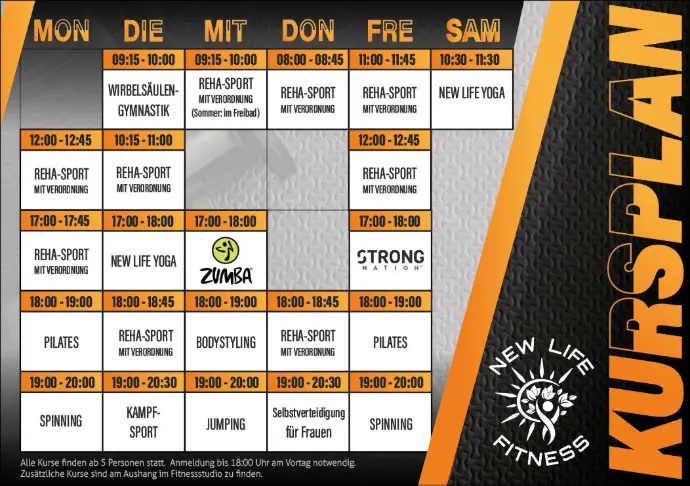 Glauben wir an die Kraft des Trainings, sowohl den Körper als auch den Geist zu verändern. Deshalb bieten wir eine breite Auswahl an Geräten und Kursen an, um jedem Fitnessbedürfnis und jeder Vorliebe gerecht zu werden.Von Krafttraining über Cardio bis :REHA-SPORT, NEW LIFE YOGA, PILATES, SPINNING, KAMPFSPORT, JUMPING, BODYSTYLING, ZUMBA, STRONG Nation, WIRBELSÄULEN,Selbstverteidigung. Unser Team aus zertifizierten Trainern ist da, um dich auf jedem Schritt deiner Fitnessreise zu unterstützen und zu motivieren. Egal ob du gerade erst anfängst oder dein Training auf das nächste Level bringen möchtest – wir haben das Wissen und die Erfahrung, um dir zum Erfolg zu verhelfen.